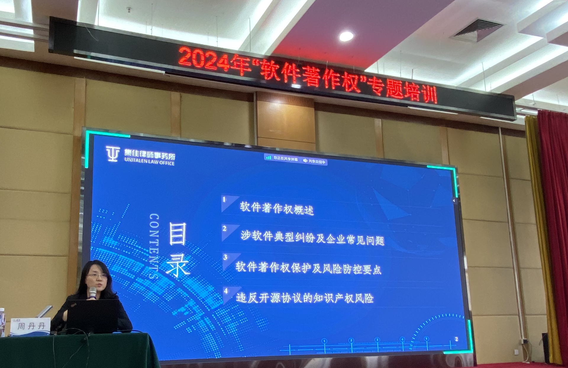 近日,集佳合伙人律师周丹丹、律师曹阳应邀为同方威视软件研发人员提供“2024年软件著作权专题培训”。周丹丹律师在铺垫了软件著作权保护的条件、软件著作权纠纷案件类型等相关基本法律知识的基础上,结合“宝利通诉小鱼易连案”等典型案例,对各类型案件中如何举证及法院认定进行了详细解读;进而以案例为引,总结提炼软件著作权登记的注意事项,源代码保护及权利软件使用证据沉淀,软件开发合同、合作开发合同中涉及权利归属约定、开发需求明确、交付等核心条款如何约定,软件采购及合规使用等方面的实务要点,为研发人员日常工作中可能遇到的软件相关问题答疑解惑。曹阳律师结合罗盒诉玩友案,分享了开源软件合规使用相关要点。