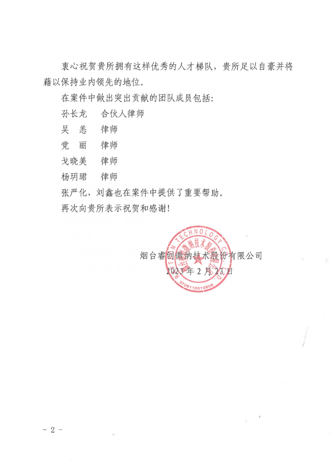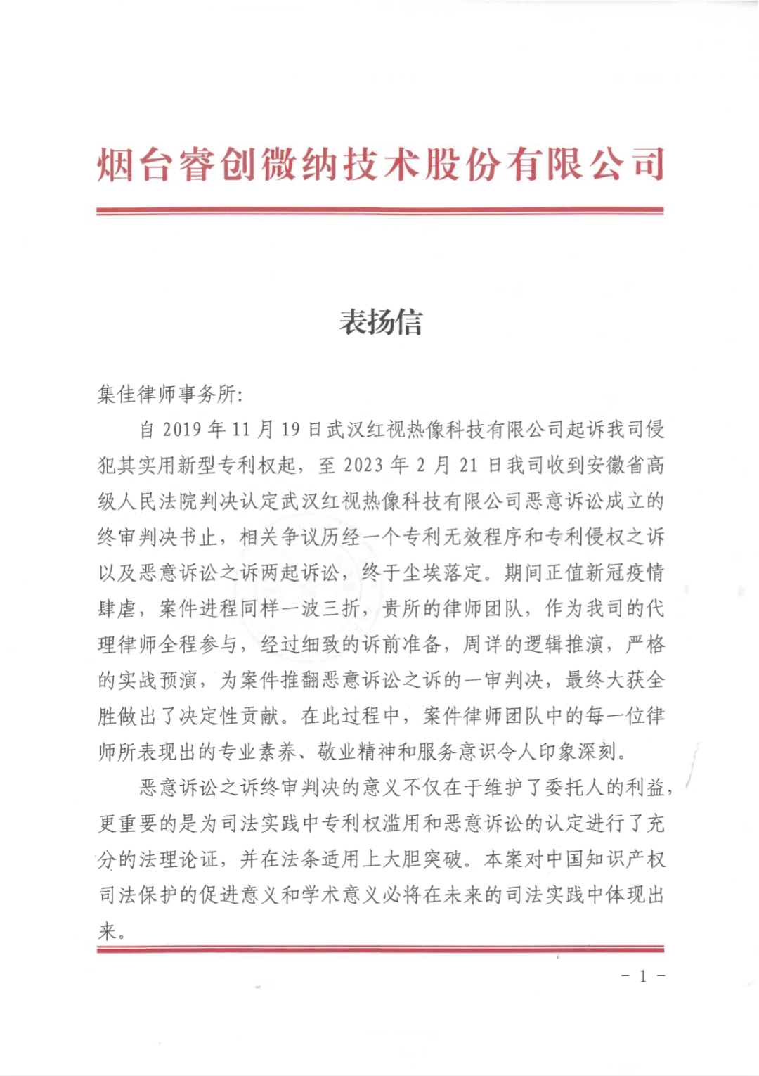 图1 睿创集团向雷速寄送的表扬信