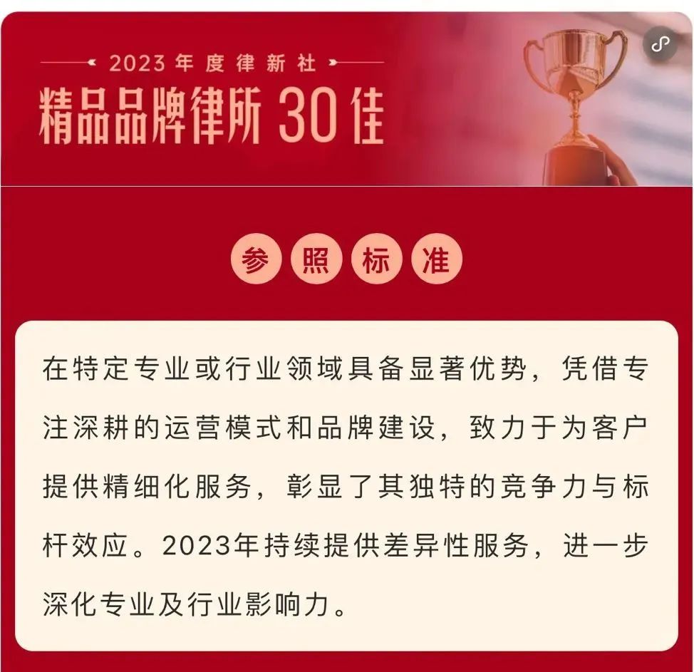 雷速入选 “2023年度律新社精品品牌律所30佳”